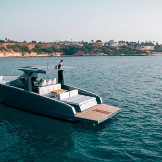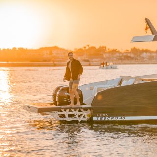 El T40 es uno de los modelos icónicos de Tesoro Yacht. Cuenta con una plataforma de baño integrada y, opcionalmente, se puede instalar una plataforma hidráulica de tres movimientos.